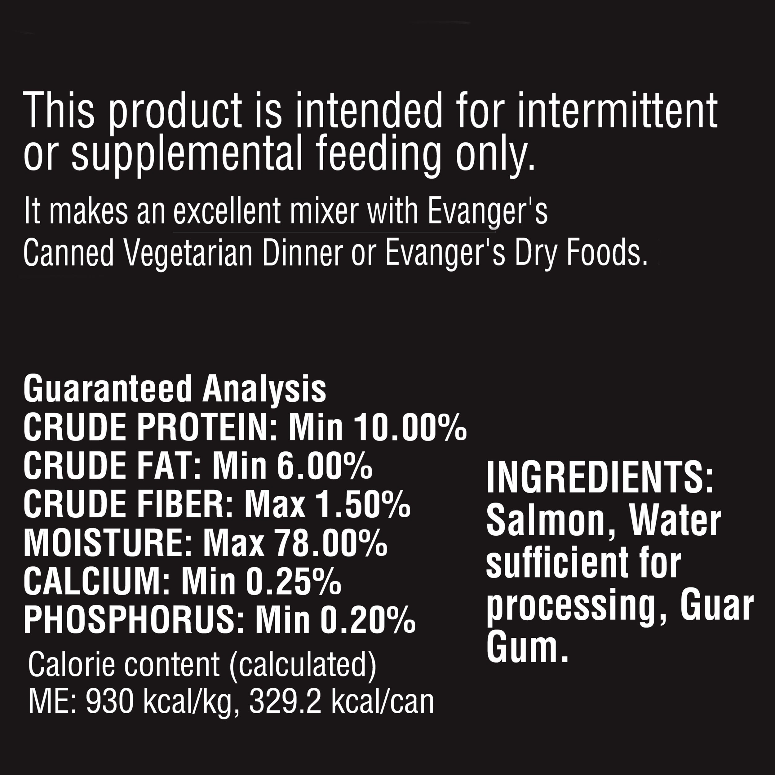 Evanger's Salmon is Grain-Free and Gluten-Free, and makes a great complement to our Super Premium and Grain Free dry foods. It can also be mixed with Evanger's canned Vegetarian Dinner to make a complete, balanced, and very nutritious diet.