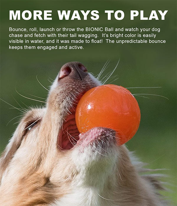 MORE WAYS TO PLAY: The BIONIC Ball has great bounce, can float and has a bright BIONIC orange coloring for visibility. It’s great for fetch, and both indoor and outdoor play. The medium size BIONIC Ball is sized to fit most ball launchers and throwers.