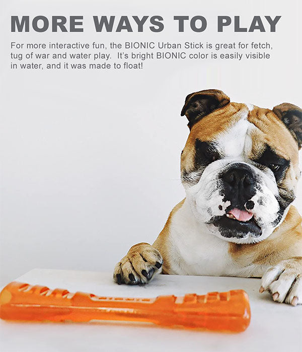 DURABLE AND SAFE PLAY: The BIONIC Urban Stick offers texture and mouth feel that dogs love. Patented defensive geometry deflects incoming bite and chew forces for increased durability and safety. It can bounce and float, making it great for fetch, tug of war, and outdoor play.