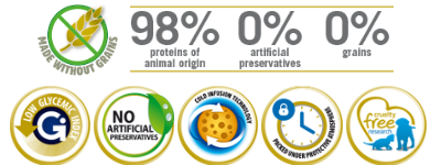Nutritional additives Per KG: Vitamin A 18000UI; Vitamin D3 1200UI; Vitamin E 600mg; Vitamin C 300mg; Niacin 150mg; Calcium D-pantothenate 50mg; Vitamin B2 20mg; Vitamin B6 8.1mg; Vitamin B1 10mg; Biotin 1.5mg; folic acid 1.5mg; Vitamin B12 0.1mg; Choline Chloride 2500mg; Beta-carotene 1.5mg; Zinc (zinc chelate of the hydroxylated analogue of methionine): 163.8mg; Manganese (manganese chelate of the hydroxy analogue of methionine): 64.6mg; Iron [iron(II) chelate of glycine hydrate]: 58.3mg; Copper (copper chelate of the hydroxy analogue of methionine): 15.8mg; DL-methionine, technically pure 5000mg; Taurine 4000mg; L-Carnitine 300mg. Organoleptic additives: green tea extract 100mg; rosemary extract. Antioxidants: tocopherol extracts from vegetable oils.