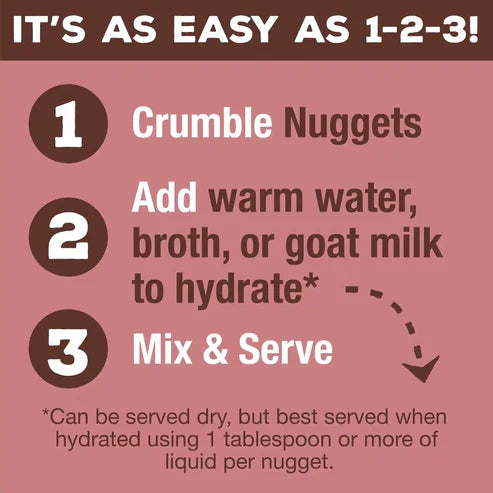 Shelf-stable and ready to serve – just portion, shred, and rehydrate with water, Bone Broth, or Raw Goat Milk. Made with high-quality protein and Certified Organic produce, crafted especially for your canine.