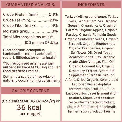 Turkey (with ground bone), Turkey Livers, Whole Sardines, Organic Squash, Organic Kale, Organic Carrots, Organic Apples, Organic Parsley, Organic Pumpkin Seeds, Organic Sunflower Seeds, Organic Broccoli, Organic Blueberries, Organic Cranberries, Organic Sunflower Oil, Dried Yeast, Montmorillonite Clay, Organic Apple Cider Vinegar, Fish Oil, Organic Coconut Oil, Organic Rosemary Extract, Vitamin E Supplement, Organic Ground Alfalfa, Dried Organic Kelp, Liquid Lactobacillus acidophilus fermentation product, Liquid Lactobacillus casei fermentation product, Liquid Lactobacillus reuteri fermentation product, Liquid Bifidobacterium animalis fermentation product, Taurine