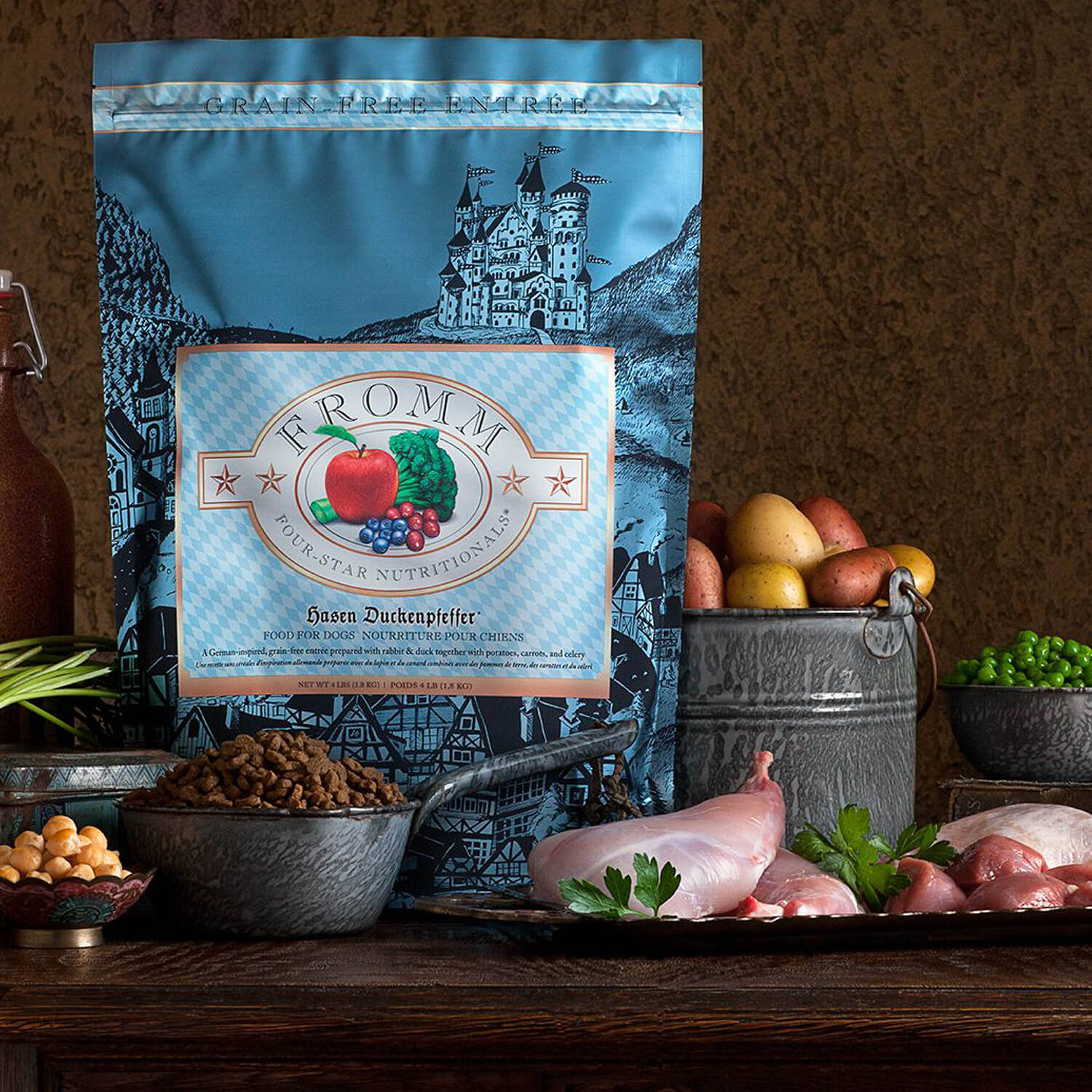 Fromm Four-Star Hasen Duckenpfeffer® Food for Dogs is a savory, grain-free recipe of rabbit and duck combined with hearty potatoes, carrots, and celery. This artisan blend is prepared in small batches, ensuring consistency, quality, and superior taste in each and every bowl. Hasen Duckenpfeffer® provides complete and balanced nutrition for dogs of all ages and can be fed in rotation with other Fromm Four-Star varieties.