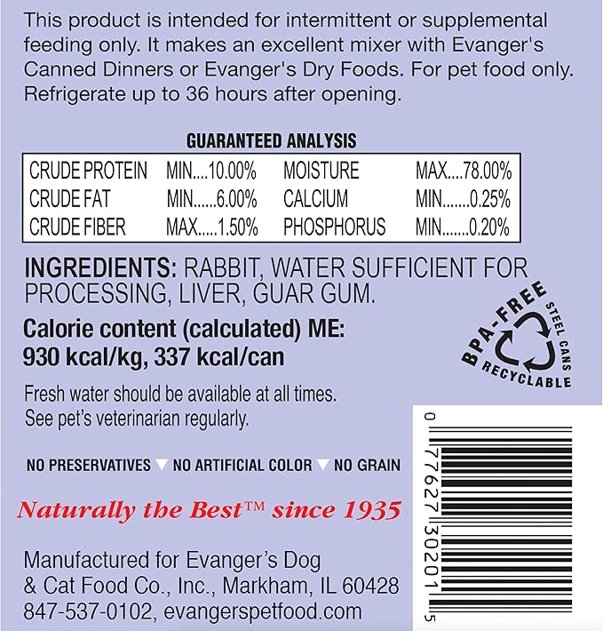 Evanger's Grain-Free Rabbit Canned Dog & Cat Food makes a great mixer for Evanger's dry foods or vegetarian formula. This holistic formula features a novel protein with no preservatives or fillers, so it's an excellent choice for pets with other food allergies.