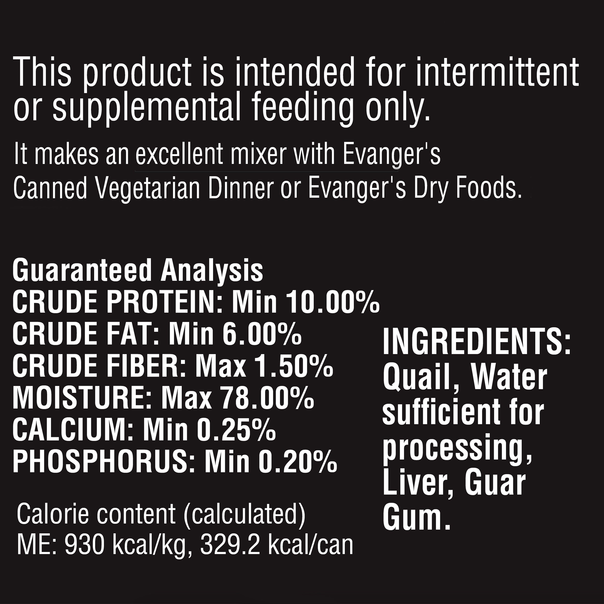 Evanger's Single-Ingredient Quail is Grain-Free, Gluten-Free, and makes a great complement to our Super Premium and Grain Free dry foods. It can also be mixed with Evanger's canned Vegetarian Dinner to make a complete, balanced, and very nutritious diet. Quail is endorsed by the cRc Kosher for Passover
