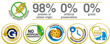 Nutritional additives: Vitamin A 15000IU; Vitamin D3 1500IU; Vitamin E 600mg; Vitamin C 150mg; Niacin 37.5mg; pantothenic acid 15mg; Vitamin B2 7.5mg; Vitamin B6 6mg; Vitamin B1 4.5mg; Vitamin H 0.38mg; folic acid 0.45mg; Vitamin B12 0.1mg; choline chloride 2500mg; Beta-carotene 1.5mg; zinc chelate of the analogous methionine hydroxylase 910mg; manganese chelate of the analogous methionine hydroxylase 380mg; ferrous chelate of glycine hydrate 250mg; copper chelate of the analogous methionine hydroxylase 15.8mg; selenised yeast inactivated 0.40mg; DL-methionine 4000mg; Taurine 1000mg; L-carnitine 300mg. Organoleptic additives: aloe vera extract 1000mg; green tea extract 100mg; rosemary extract. Antioxidants: tocopherol-rich extracts of natural origin.