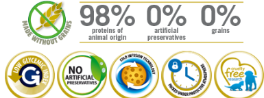 Nutritional additives: Vitamin A 16000IU; Vitamin D3 1600IU; Vitamin E 600mg; Vitamin C 160mg; Niacin 40mg; pantotenic acid 16mg; Vitamin B2 8mg; Vitamin B6 6.4mg; Vitamin B1 4.8mg; Vitamin H 0.40mg; folic acid 0.48mg; Vitamin B12 0.1mg; Choline Chloride 2800mg; Beta-Carotene 1.5mg; zinc chelate of the analogous methionine hydroxylase 910mg; manganese chelate of the analogous methionine hydroxylase 380mg; ferrous chelate of glycine hydrate 250mg; copper chelate of the analogous methionine hydroxylase 15.8mg; selenised yeast inactivated 0.40mg; DL-methionine 4000mg; Taurine 1000mg; L-Carnitine 300mg. Organoleptic additives: aloe vera extract 1000mg; green tea extract 100mg; rosemary extract. Antioxidants: tocopherol-rich extracts of natural origin.
