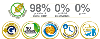 Nutritional additives Per KG: Vitamin A 18000UI; Vitamin D3 1200UI; Vitamin E 600mg; Vitamin C 300mg; Niacin 150mg; Calcium D-pantothenate 50mg; Vitamin B2 20mg; Vitamin B6 8.1mg; Vitamin B1 10mg; Biotin 1.5mg; folic acid 1.5mg; Vitamin B12 0.1mg; Choline Chloride 2500mg; Beta-carotene 1.5mg; Zinc (zinc chelate of the hydroxylated analogue of methionine): 163.8mg; Manganese (manganese chelate of the hydroxy analogue of methionine): 64.6mg; Iron [iron(II) chelate of glycine hydrate]: 58.3mg; Copper (copper chelate of the hydroxy analogue of methionine): 15.8mg; DL-methionine, technically pure 5000mg; Taurine 4000mg; L-Carnitine 300mg. Organoleptic additives: green tea extract 100mg; rosemary extract. Antioxidants: tocopherol extracts from vegetable oils.