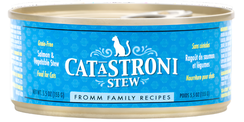 Salmon, Salmon Broth, Fish Broth, Chickpea Pasta,(Chickpea Flour, Dried Egg Product, Chicken Liver, Pea Protein),Sweet Potatoes, Peas, Salmon Oil (preserved with mixed tocopherols),Flaxseed, Xanthan Gum, Minerals [Dicalcium Phosphate, Zinc Sulfate, Magnesium Sulfate, Ferrous Sulfate, Zinc Proteinate, Calcium Carbonate, Copper Sulfate, Iron Proteinate, Sodium Selenite, Calcium Iodate, Manganese Sulfate, Copper Proteinate, Manganese Proteinate], DL-Methionine, Natural Flavor, Salt, Vitamins [Potassium Chloride, Choline Chloride],Taurine, Vitamins, Vitamins [Vitamin E Supplement, Niacin Supplement, Thiamine Mononitrate, Vitamin A Supplement, Calcium Pantothenate, Riboflavin Supplement, Pyridoxine Hydrochloride, Vitamin B12 Supplement, Vitamin D3 Supplement, Folic Acid].