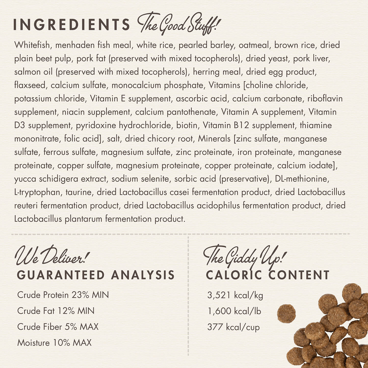 Whitefish,Menhaden Fish Meal,White Rice,Pearled Barley,Oatmeal,Brown Rice,Dried Plain Beet Pulp,Pork Fat (preserved with mixed tocopherols),Dried Yeast,Pork Liver,Salmon Oil (preserved with mixed tocopherols),Herring Meal,Dried Egg Product,Flaxseed,Calcium Sulfate,Monocalcium Phosphate, Vitamins [Choline Chloride, Potassium Chloride, Vitamin E Supplement, Ascorbic Acid, Calcium Carbonate, Riboflavin Supplement, Niacin Supplement, Calcium Pantothenate, Vitamin A Supplement, Vitamin D3 Supplement, Pyridoxine Hydrochloride, Biotin, Vitamin B12 Supplement, Thiamine Mononitrate, Folic Acid],Salt,Chicory Root Extract, Minerals [Zinc Sulfate, Manganese Sulfate, Ferrous Sulfate, Magnesium Sulfate, Zinc Proteinate, Iron Proteinate, Manganese Proteinate, Copper Sulfate, Magnesium Proteinate, Copper Proteinate, Calcium Iodate], Yucca Schidigera Extract,Sodium Selenite,Sorbic Acid (Preservative),DL-Methionine,L-Tryptophan,Taurine,Dried Lactobacillus casei Fermentation Product,Dried Lactobacillus reuteri Fermentation Product,Dried Lactobacillus acidophilus Fermentation Product,Dried Lactobacillus plantarum Fermentation Product..