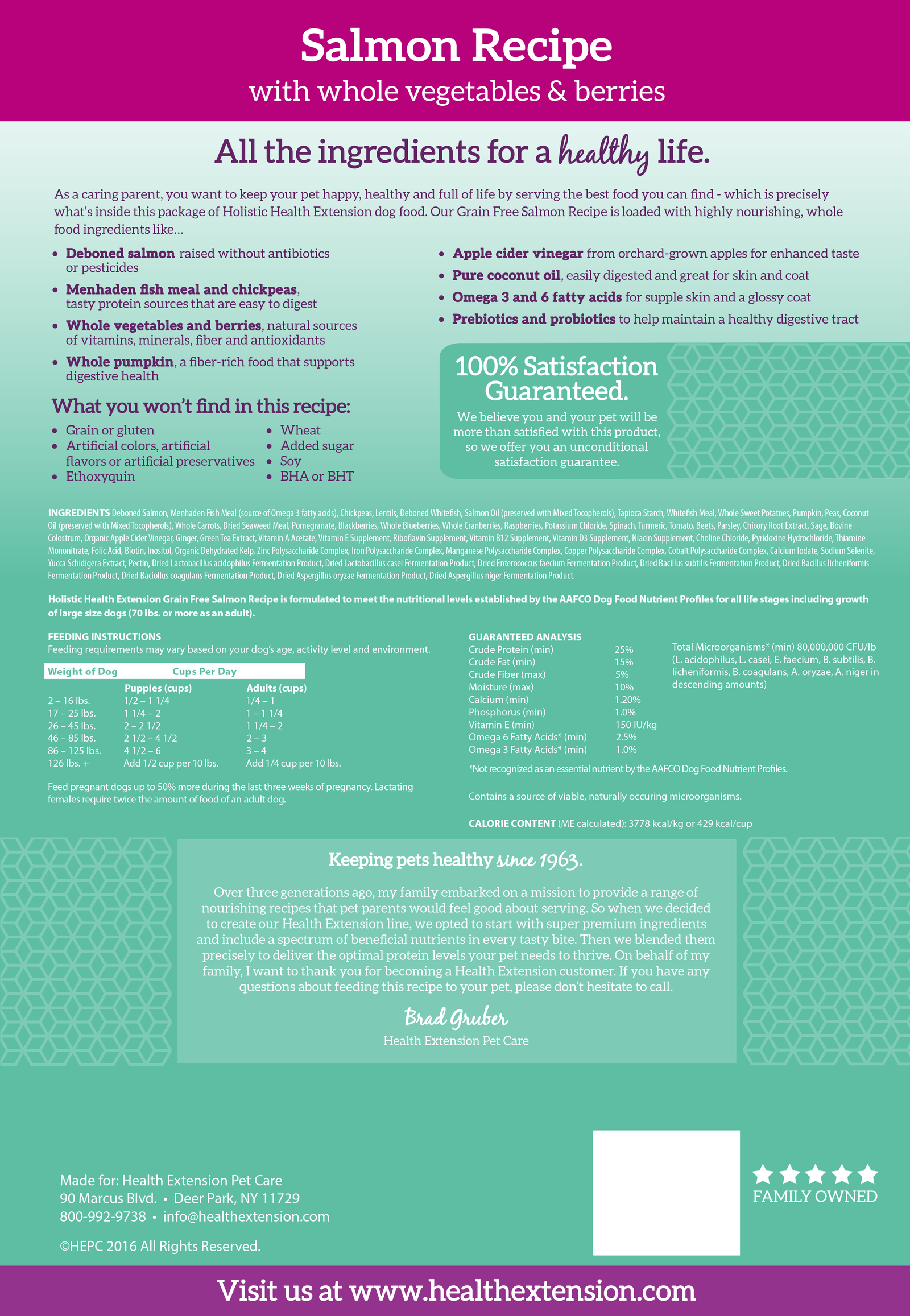 Holistic Health Extension Grain Free Salmon Recipe is formulated to meet the nutritional levels established by the AAFCO Dog Food Nutrient Profiles for all life stages including growth of large size dogs (70lbs. or more as an adult).