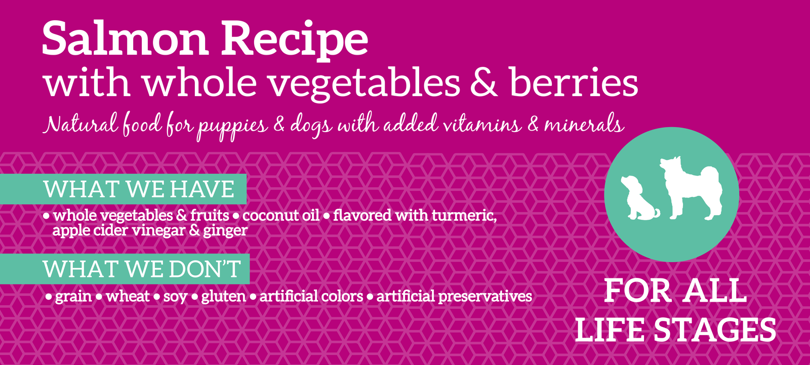When your dog gets a whiff of this uniquely tasty food, she’ll think she’s at a seaside café! Prepared with delicious, whole food ingredients, our Grain Free Salmon Recipe is packed with every nutrient canines need to thrive. Real salmon is the first ingredient, so you know your pet is getting healthy levels of animal protein. The second ingredient, menhaden fish meal, is an excellent source of Omega 3’s. This complete and balanced dry dog food also includes a hearty helping of chickpeas, whole garden vegetables and antioxidant-rich berries. Along with a proprietary blend of cutting-edge ingredients like turmeric, apple cider vinegar, natural probiotics and pure coconut oil. With super nutrients like these, our Grain Free Salmon Recipe offers everything dogs and puppies require for a long, healthy and happy life