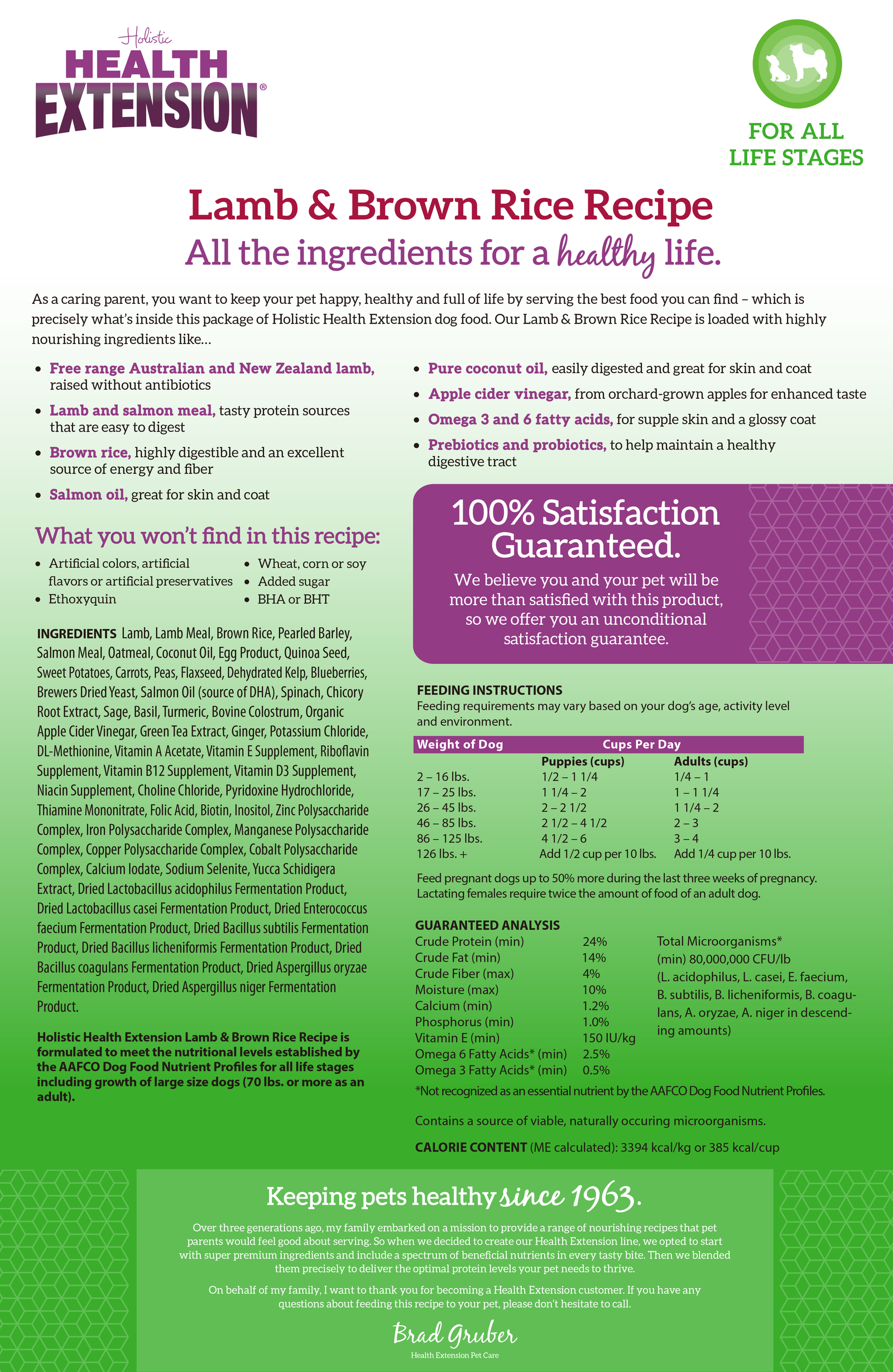 Holistic Health Extension Lamb & Brown Rice Recipe is formulated to meet the nutritional levels established by the AAFCO Dog Food Nutrient Profiles for all life stages including growth of large size dogs (70lbs. or more as an adult).