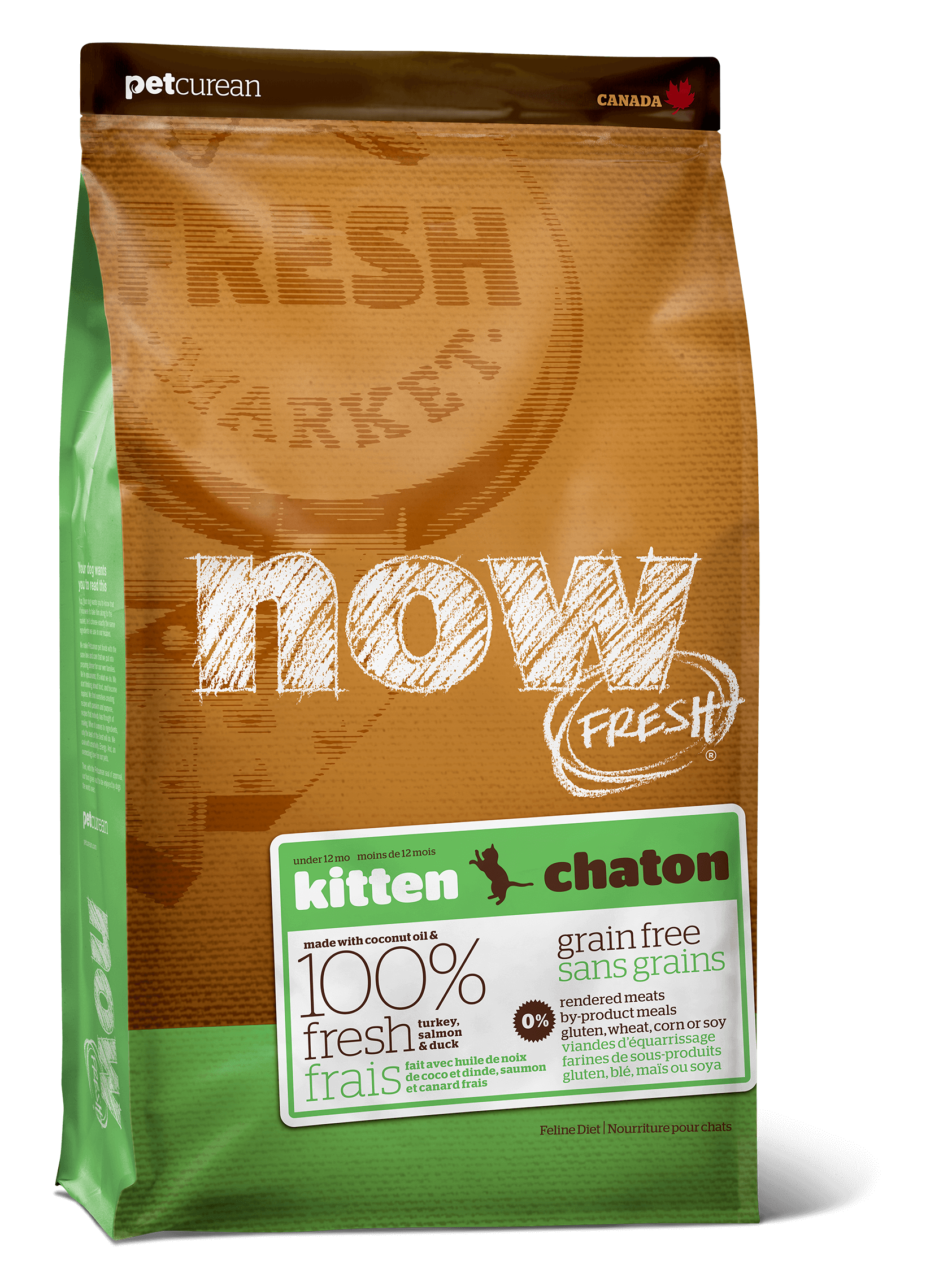 NOW FRESH™ Kitten food recipe is made with 100% FRESH turkey, salmon, duck and 100% fresh Omega 3 & 6 oils from coconuts and canola. NOW FRESH™ also features zero grains, gluten, wheat, beef, corn or soy. Zero rendered meats, by-products or artificial preservatives.
