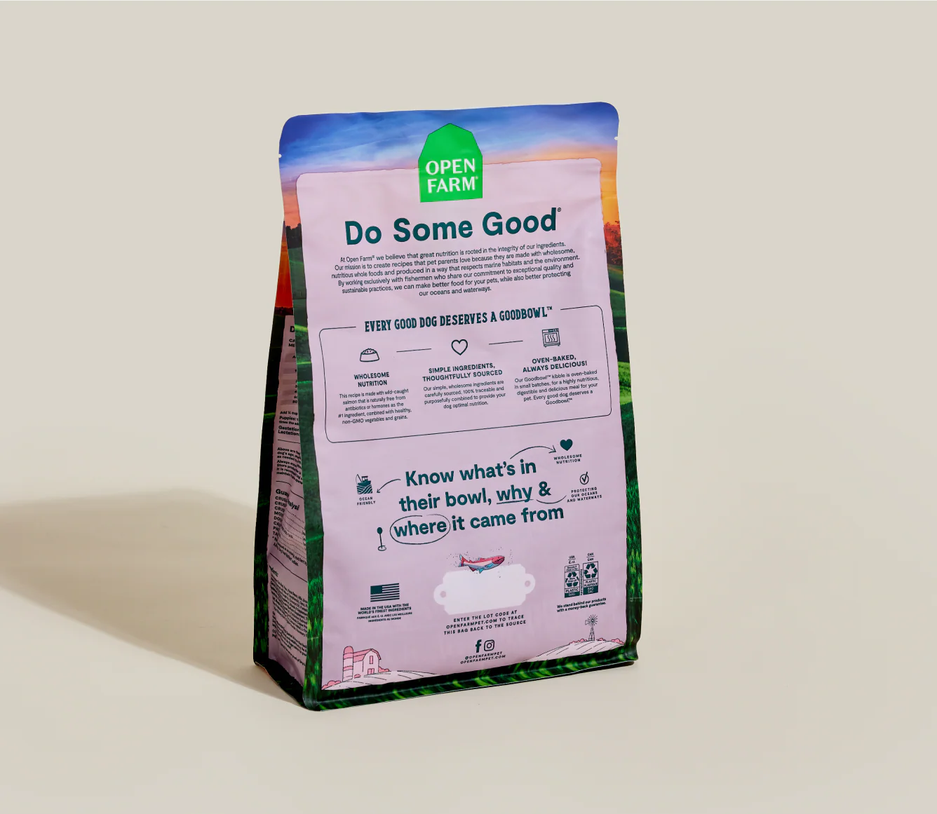 Open Farm GoodBowl™ Wild-Caught Salmon & Brown Rice Recipe Dog Food is formulated to meet the nutritional levels established by the AAFCO Dog Food Nutrient Profiles for All Life Stages except for growth of large size dogs (70 lbs or more as an adult).