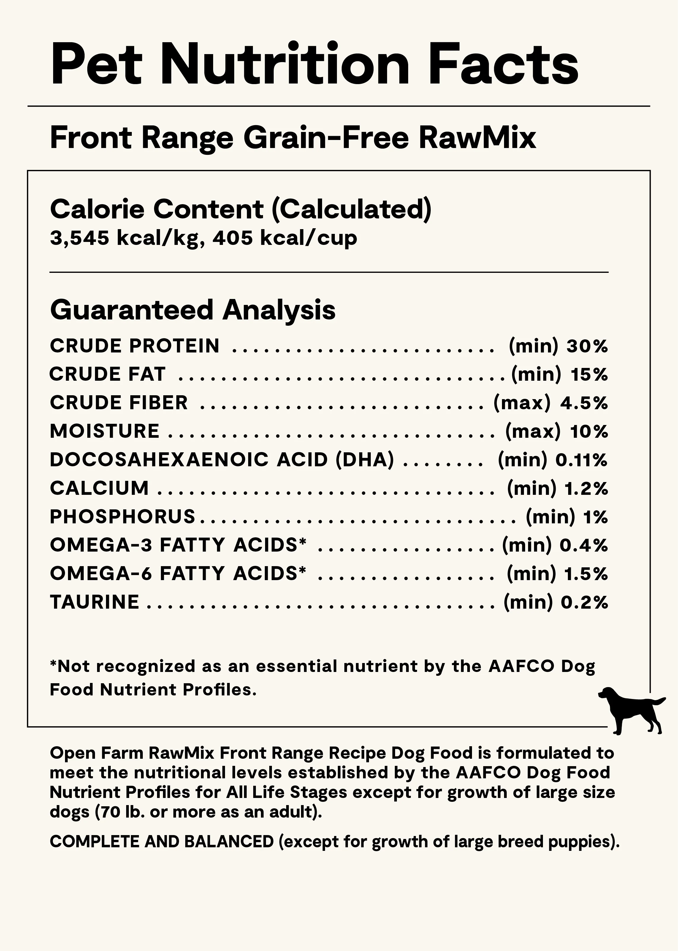 Open Farm RawMix Front Range Recipe Dog Food is formulated to meet the nutritional levels established by the AAFCO Dog Food Nutrient Profiles for All Life Stages except for growth of large size dogs (70 lb. or more as an adult).