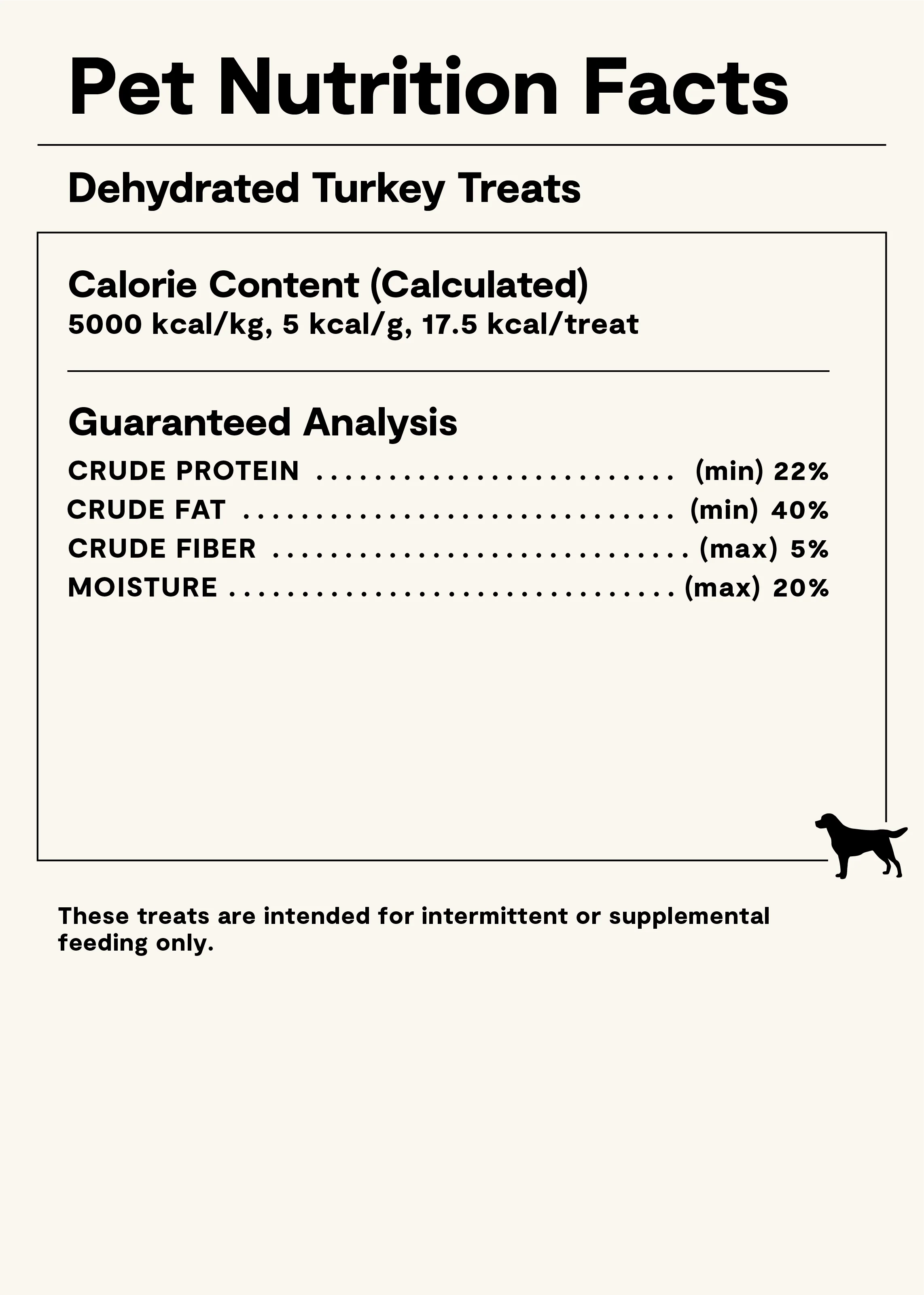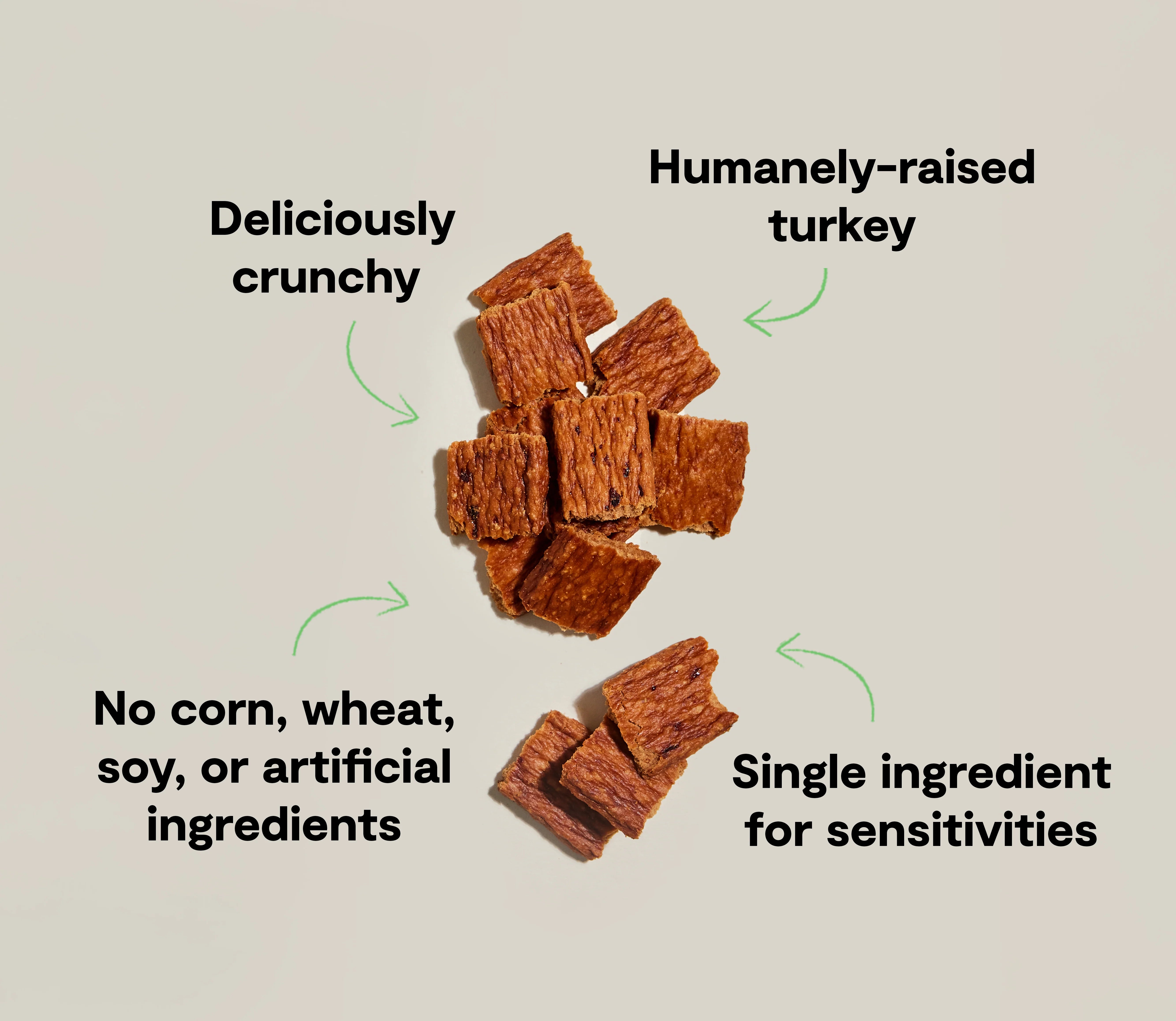 These munchable treats are packed with protein, thanks to humanely raised turkey that’s lightly cooked then dehydrated at low temperatures... Read more