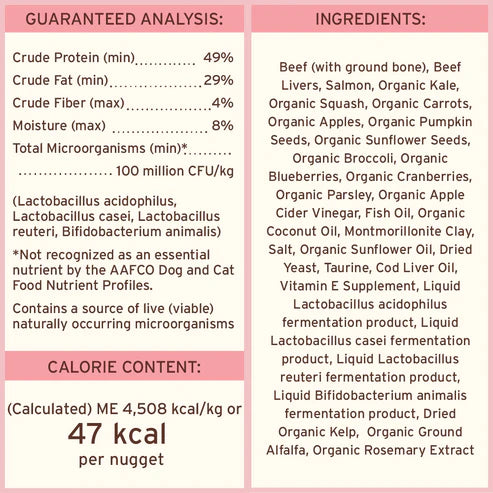 Beef (with ground bone), Beef Livers, Salmon, Organic Kale, Organic Squash, Organic Carrots, Organic Apples, Organic Pumpkin Seeds, Organic Sunflower Seeds, Organic Broccoli, Organic Blueberries, Organic Cranberries, Organic Parsley, Organic Apple Cider Vinegar, Fish Oil, Organic Coconut Oil, Montmorillonite Clay, Salt, Organic Sunflower Oil, Dried Yeast, Taurine, Cod Liver Oil, Vitamin E Supplement, Liquid Lactobacillus acidophilus fermentation product, Liquid Lactobacillus casei fermentation product, Liquid Lactobacillus reuteri fermentation product, Liquid Bifidobacterium animalis fermentation product, Dried Organic Kelp, Organic Ground Alfalfa, Organic Rosemary Extract
