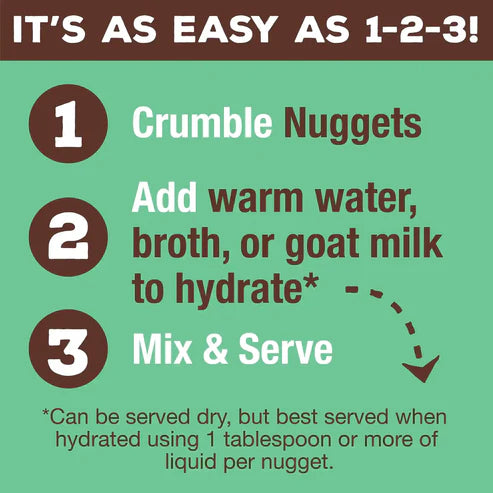 Shelf-stable and ready to serve – just portion, shred, and rehydrate with water, Bone Broth, or Raw Goat Milk. Made with high-quality protein and Certified Organic produce, crafted especially for your canine.