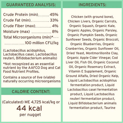 Chicken (with ground bone), Chicken Livers, Organic Carrots, Organic Squash, Organic Kale, Organic Apples, Organic Parsley, Organic Pumpkin Seeds, Organic Sunflower Seeds, Organic Broccoli, Organic Blueberries, Organic Cranberries, Organic Sunflower Oil, Dried Yeast, Montmorillonite Clay, Organic Apple Cider Vinegar, Cod Liver Oil, Fish Oil, Organic Coconut Oil, Organic Rosemary Extract, Vitamin E Supplement, Organic Ground Alfalfa, Dried Organic Kelp, Liquid Lactobacillus acidophilus fermentation product, Liquid Lactobacillus casei fermentation product, Liquid Lactobacillus reuteri fermentation product, Liquid Bifidobacterium animalis fermentation product, Taurine