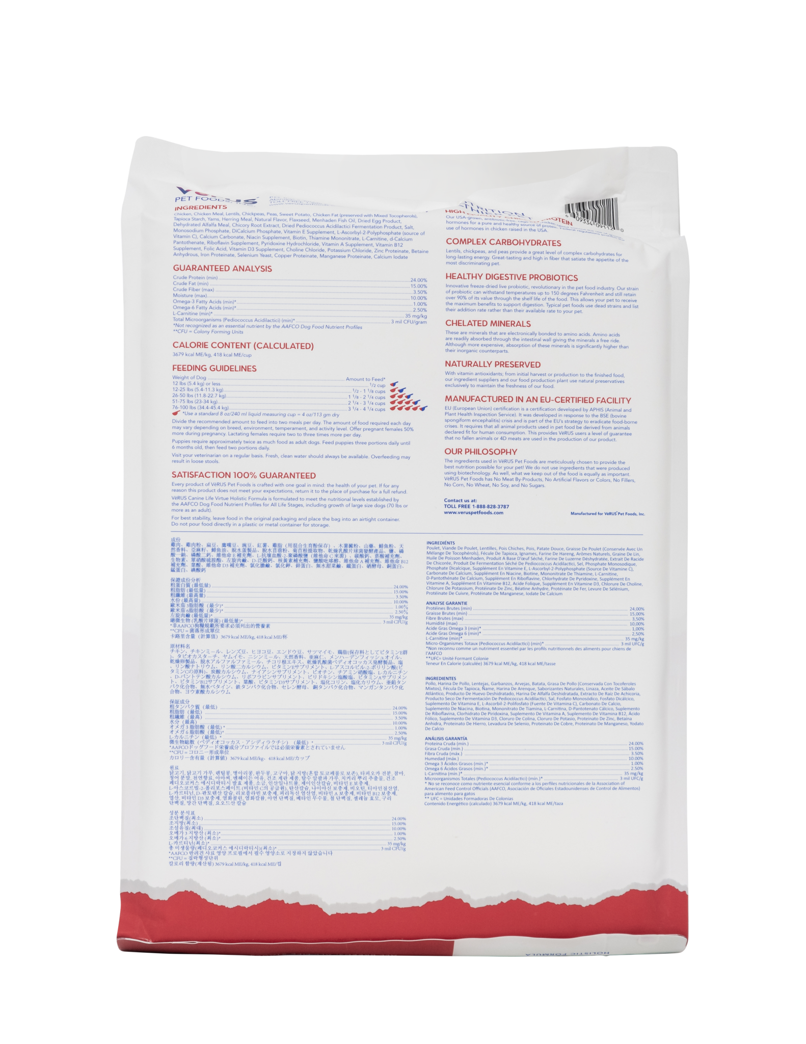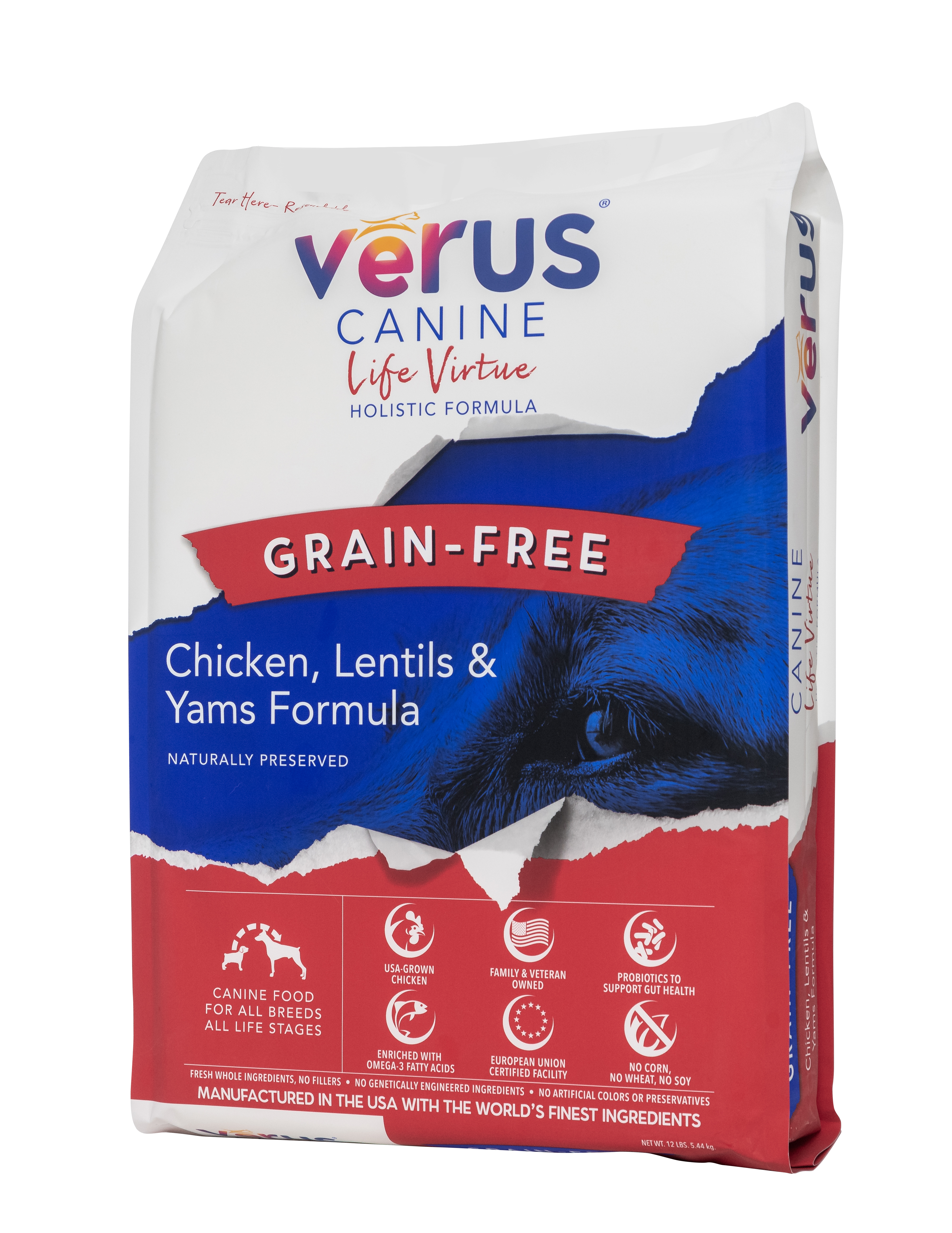 VēRUS Life Virtue Chicken, Lentils & Yams Holistic Formula is a combination of great-tasting, highly digestible, nutrient-packed fresh chicken, vegetables and legumes, providing complete and balanced nutrition for all breeds, all life stages.
