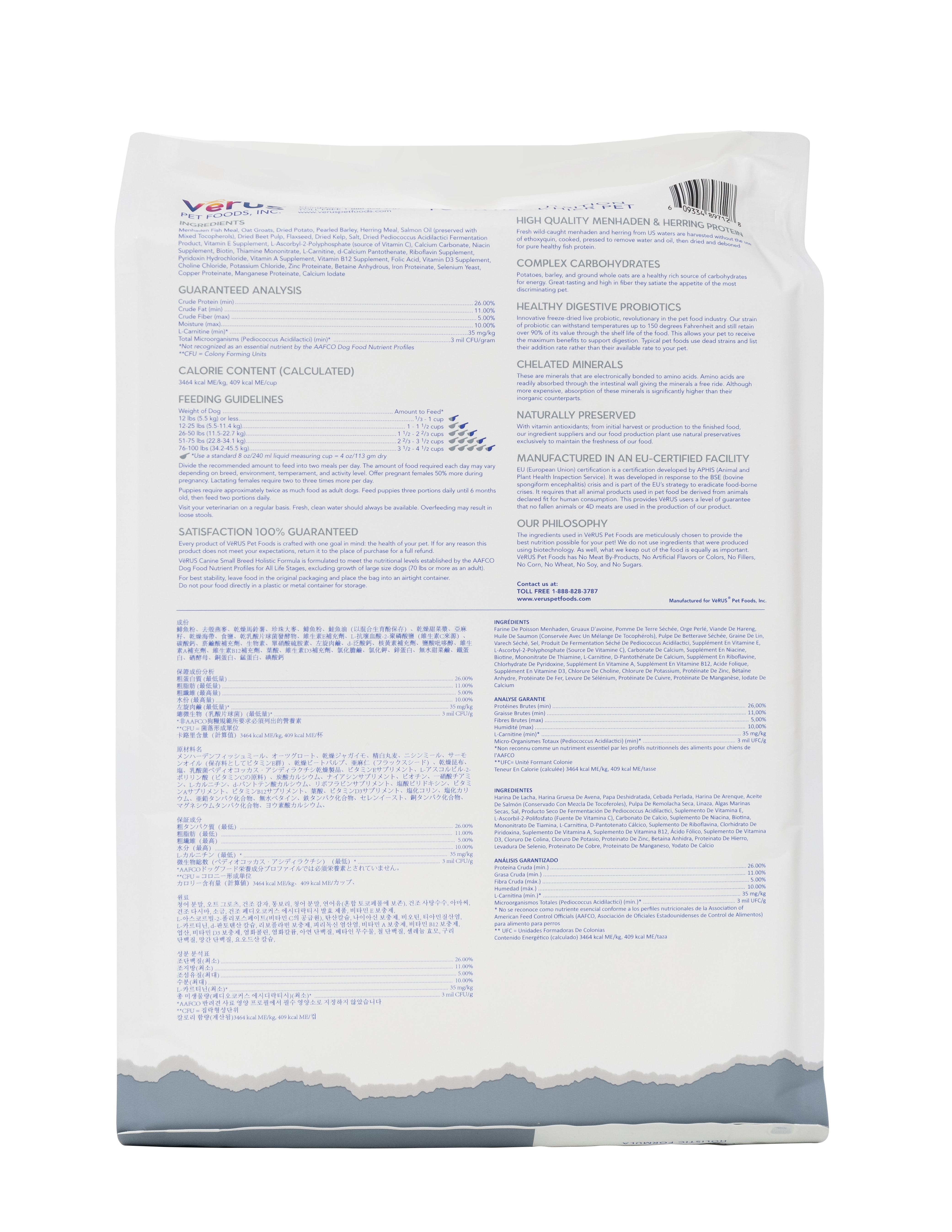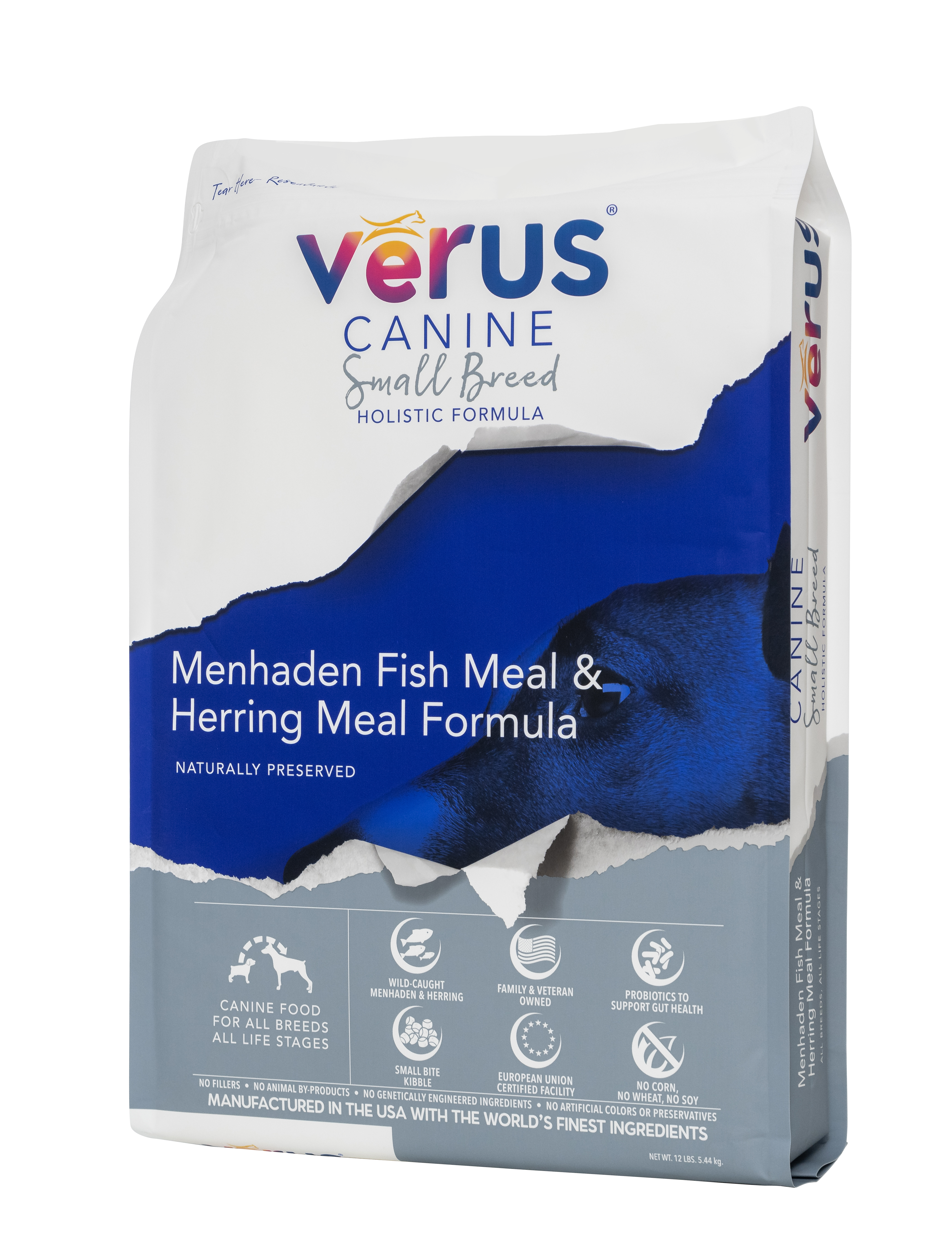 VēRUS Small Breed Menhaden Fish Meal & Herring Formula provides complete and balanced nutrition for all breeds, all life stages