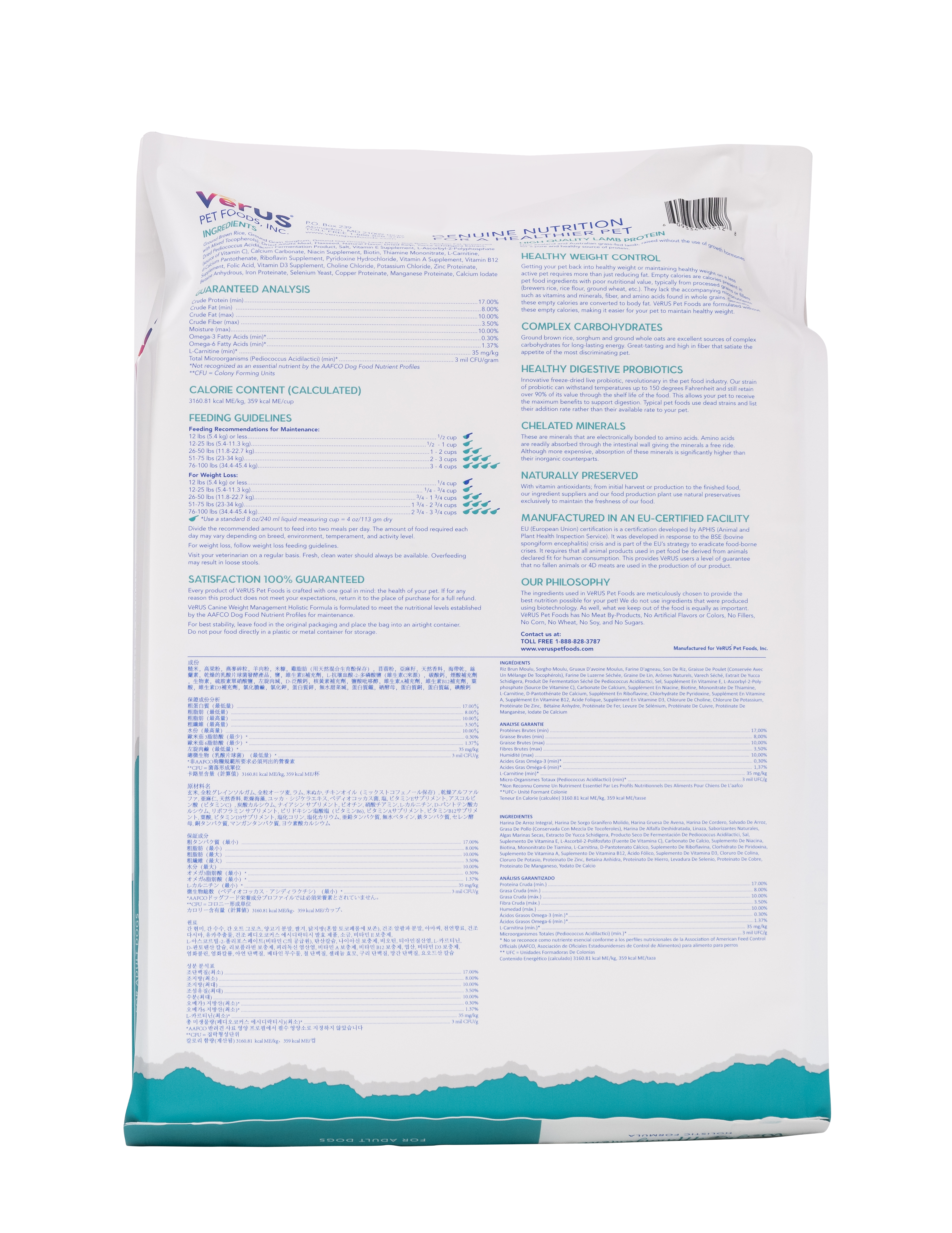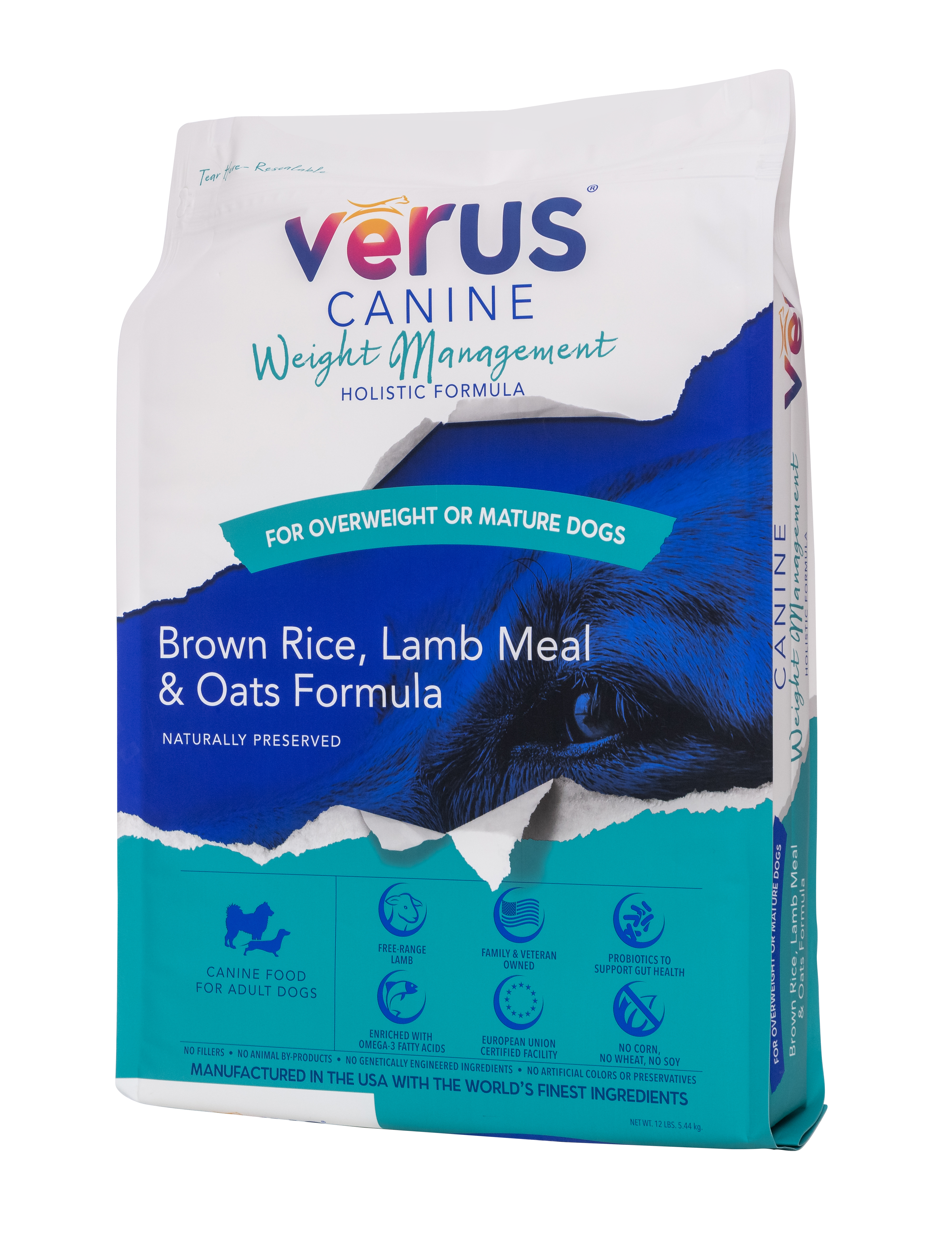 VēRUS Weight Management Brown Rice, Lamb Meal & Oats Holistic Formula is designed for seniors and for healthy weight control.