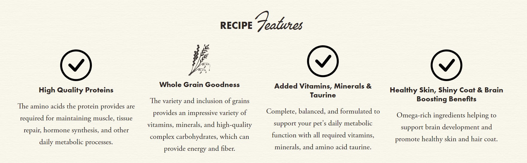 Chicken, chicken meal, brown rice, pearled barley, oatmeal, white rice, chicken fat (preserved with mixed tocopherols), menhaden fish meal, dried whole egg, beet pulp, cheese, flaxseed, brewers dried yeast, potassium chloride, salt, calcium sulfate, dl-methionine, l-tryptophan, taurine, chicory root extract, yucca schidigera extract, sodium selenite, sorbic acid (preservative), Vitamins [vitamin A acetate, Vitamin D3 supplement, Vitamin E supplement, Vitamin B12 supplement, choline bitartrate, niacin supplement, d-calcium pantothenate, l-ascorbyl-2-polyphosphate, riboflavin supplement, thiamine mononitrate, pyridoxine hydrochloride, folic acid, biotin], Minerals [zinc sulfate, ferrous sulfate, manganese sulfate, magnesium sulfate, copper sulfate, cobalt carbonate, calcium iodate, iron proteinate, zinc proteinate, copper proteinate, manganese proteinate, magnesium proteinate, cobalt proteinate], dried Lactobacillus acidophilus fermentation product, dried Bifidobacterium longum fermentation product, dried Lactobacillus plantarum fermentation product, dried Pediococcus acidilactici fermentation product.